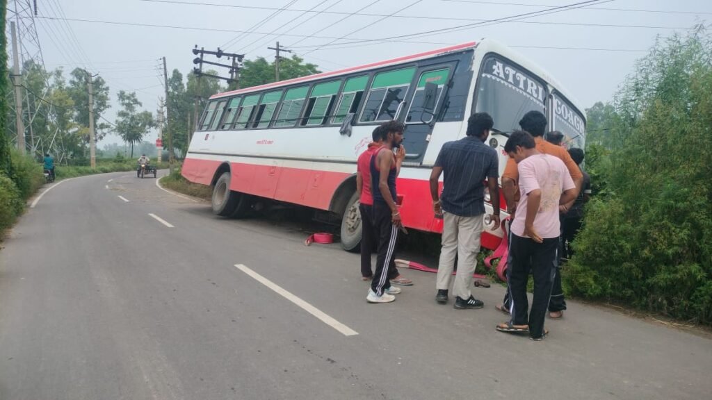 अनियंत्रित होकर सड़क किनारे गड्ढे में उतरी बस, बाल बाल बचे बस के यात्री।