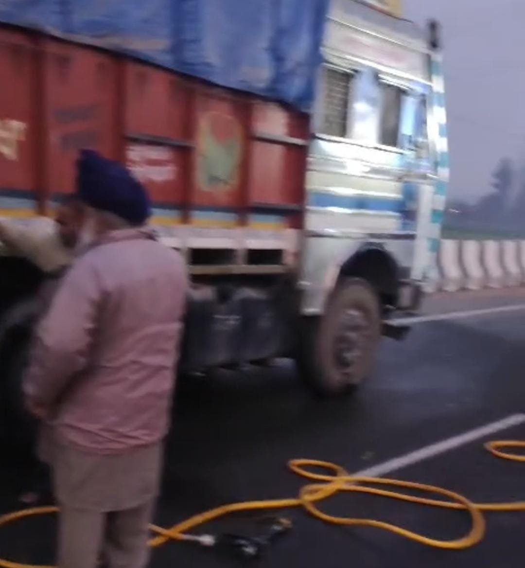 राष्ट्रीय राजमार्ग पर चलते ट्रक के टायरों में लगी।आग, समय रहते आग पर पाया गया काबू।