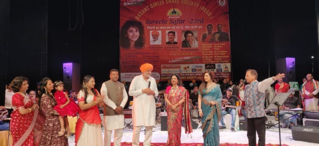 चंडीगढ़ ( क्राइम रिपोर्टर सुनील कुमार ) स्वर कोकिला सुश्री लता मंगेशकर की जयंती पर बसंत गिरिजा श्री सोसायटी की संस्थापक रंजू प्रसाद (1988) बैच की भारतीय डाक सेवा अधिकारी) (सेवानिवृत) एवं उनके पति डा. एस, एस प्रसाद, (आईएएस) अतिरिक्त मुख्य सचिव, हरियाणा, गृह विभाग, (सेवानिवृत ) द्वारा स्थापित एवं संचालित सस्था की ओर से टैगोर थियेटर, सेक्टर 18, चंडीगढ़ में ‘जिंदगी हर कदम इक नई जंग है. जीत जाएंगे हम सुरीला सफर-23 का संगीतमय शाम का आयोजन 20 सितंबर 2025 शाम 4.30 बजे से कार्यक्रम शुभ आरम्भ हुआ। बसंत गिरिजा श्री सोसाइटी लगभग 20 वर्षों से पंजीकृत द्वारा आयोजित इस कार्यक्रम का ऑपरेशन सिंदूर और भारतीय जवानों को भी समर्पित किया गया।