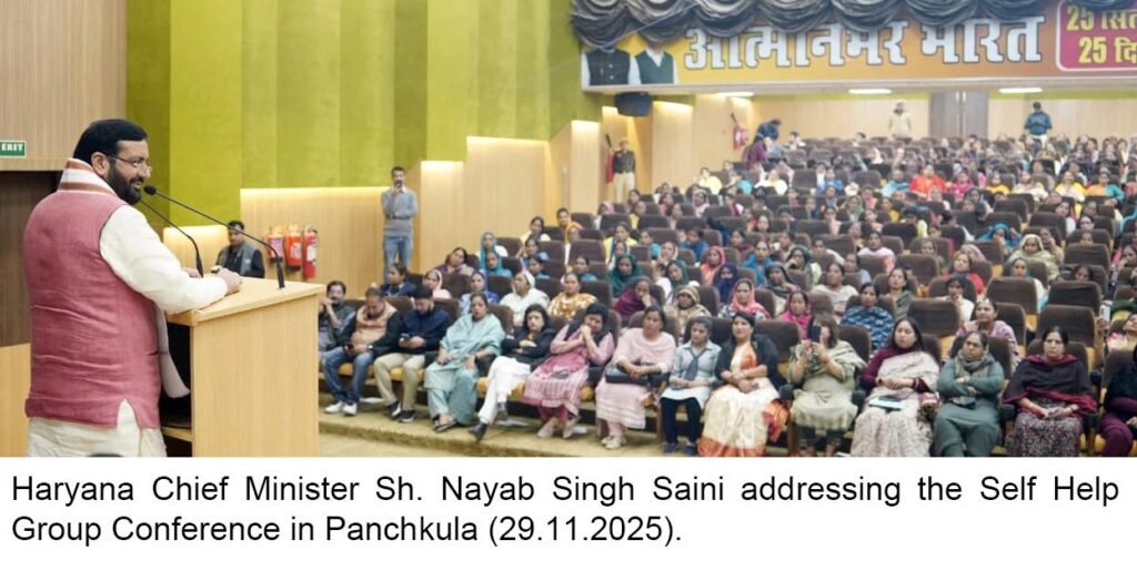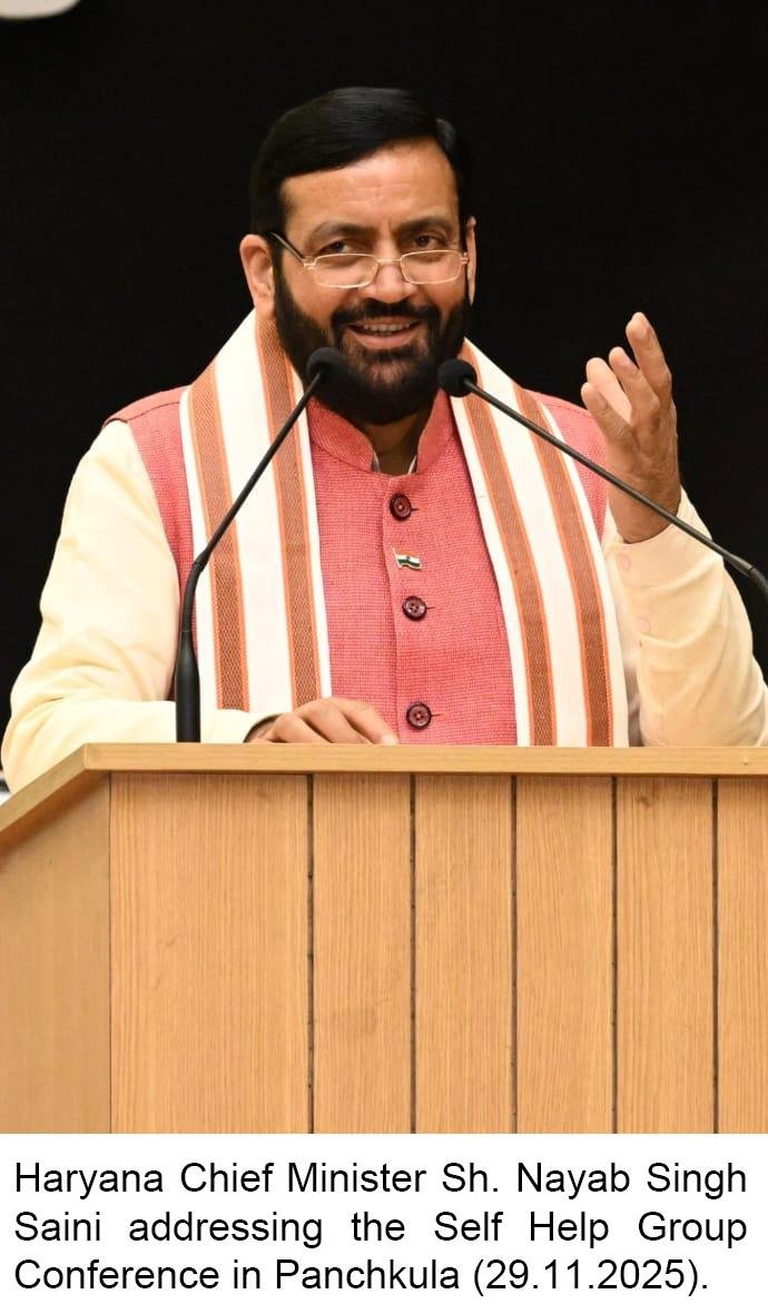मुख्यमंत्री नायब सिंह सैनी शनिवार को पंचकूला में स्वयं सहायता समूह सम्मेलन में महिलाओं को सम्बोधित कर रहे थे।