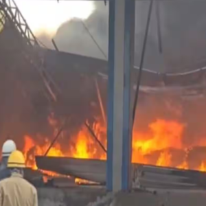 अधिकारी ने कहा कि आग कारखाने और निकटवर्ती गोदाम में लगी।