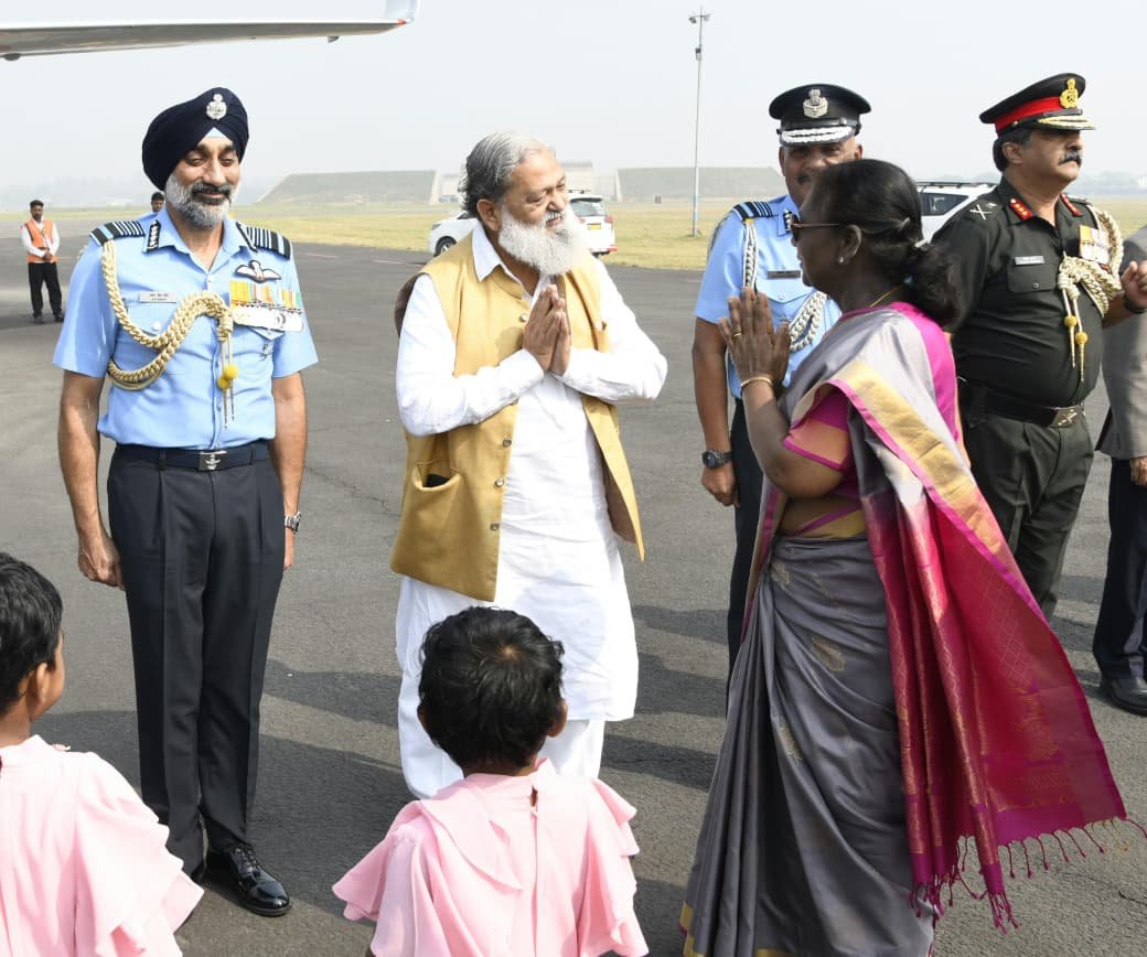 राष्ट्रपति द्रौपदी मुर्मू का अंबाला वायुसेना स्टेशन पर आगमन — हरियाणा के ऊर्जा मंत्री अनिल विज ने किया स्वागत