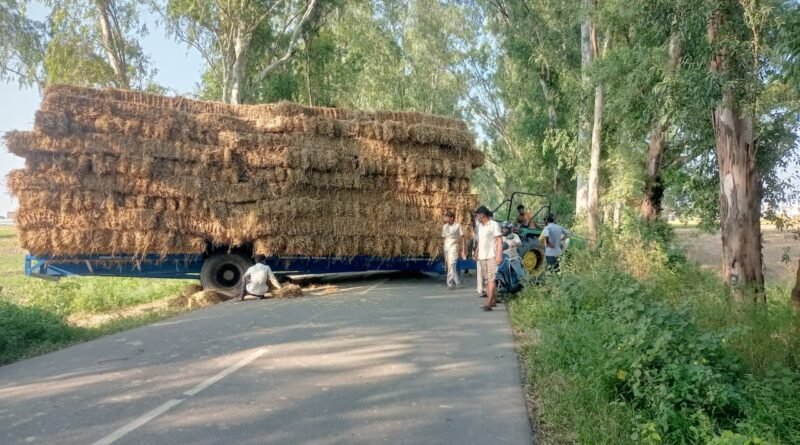 पराली की गाठों से लदी ट्रैक्टर ट्राली पलटी बाल बाल बचा ट्रैक्टर चालक