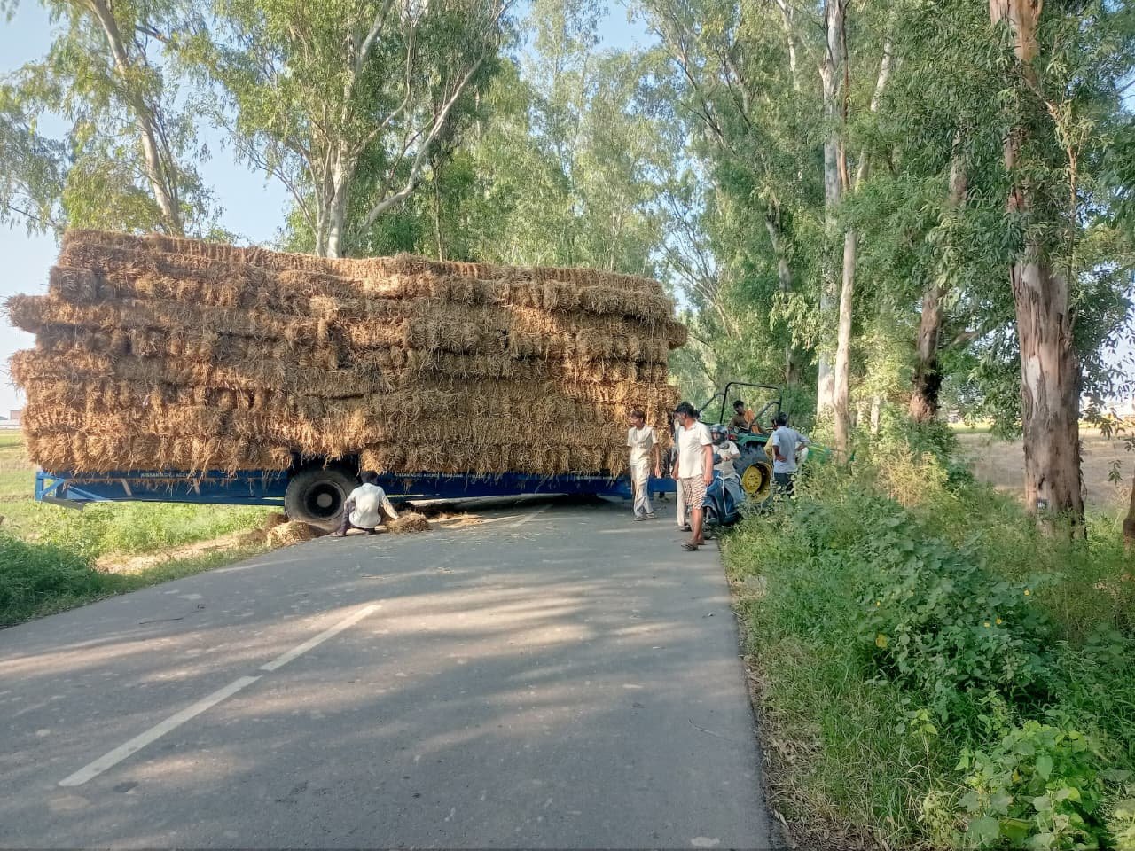 पराली की गाठों से लदी ट्रैक्टर ट्राली पलटी बाल बाल बचा ट्रैक्टर चालक